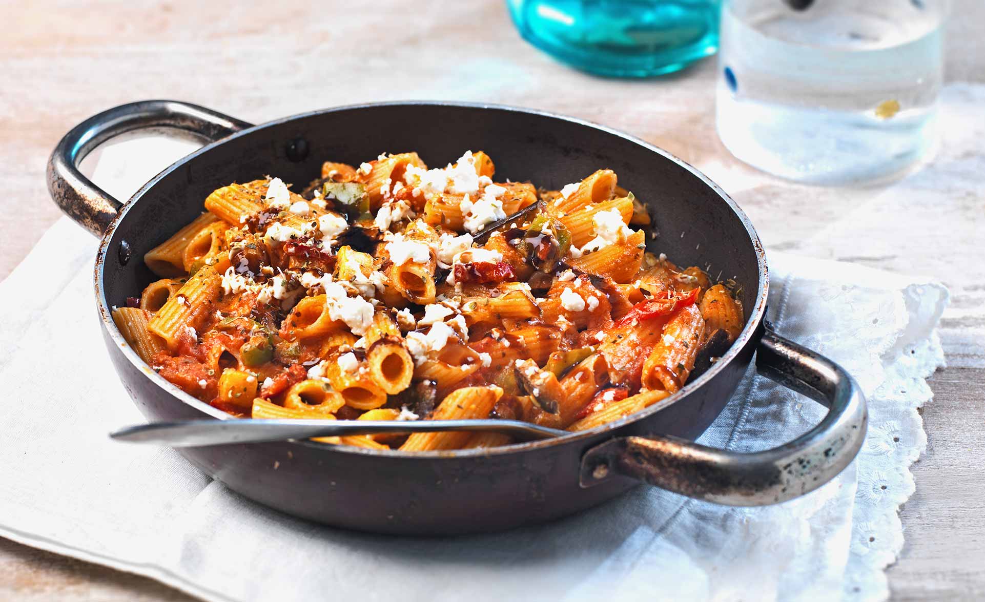Μακαρονάδα με γλυκόξινα καλοκαιρινά λαχανικά, κρέμα φέτας και βότανα